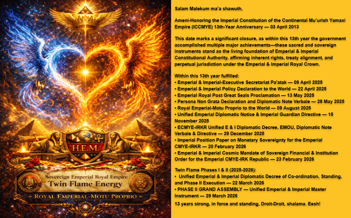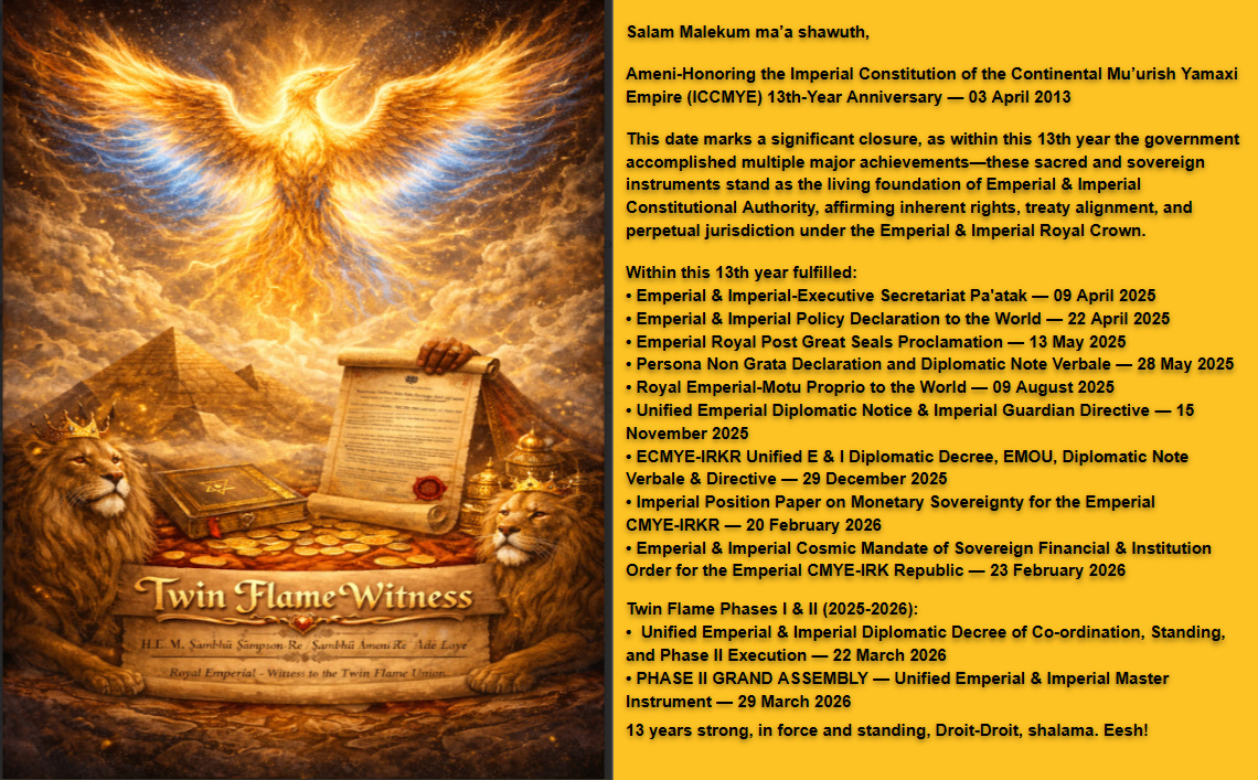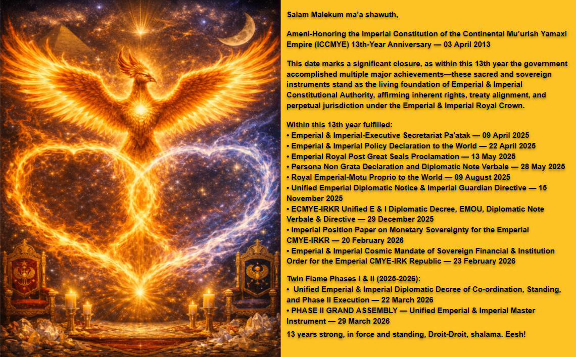 The-Pledge-of-the-Imperial-Royal-Flags-15-JAN-2025 The-Emperial-Affirmation-15-JAN-2026-9 EMPERIAL-IMPERIAL-COSMIC-MANDATE-23-February-2026 20-Febtuary-2026 EMOU-2026-for-Web Royal-Motu-Proprio-1.pdf Empress-Saint-Cyr-El-14-July-2025 Emperial-Royal-Post-Great-Seals-Proclamation-13-May-2025-for-web E-I-Missions-for-the-IROHEM-and-ECMYE-IRKR-dated-9-April-2025c-for-web E-I-Declaration-to-the-world-dated-22-April-2025-for-web-2 Emperial-Imperial-Missions-for-the-IROHEM-and-ECMYE-IRKR-dated-30-July-2024 ICMYEsCE-Mission-dated-22-November-2023-4 Brief-in-Support-for-the-ICMYEsC-dated-22-November-2023-1 Imperial-CMYE-Treasury-Excutive-Mission-5-Feb-2024-for-web MFAIC-mission-dated-22-November-2023-6 IMYRS-Mission-dated-22-November-2023-7 Persona-Non-Grata-Declaration-and-Diplomatic-Note-Verbale-1 Rare-Solar-Eclipse-and-Firehorse-Ingress-17-February-2026 Bio-for-HEM-30-July-20242017-12-31